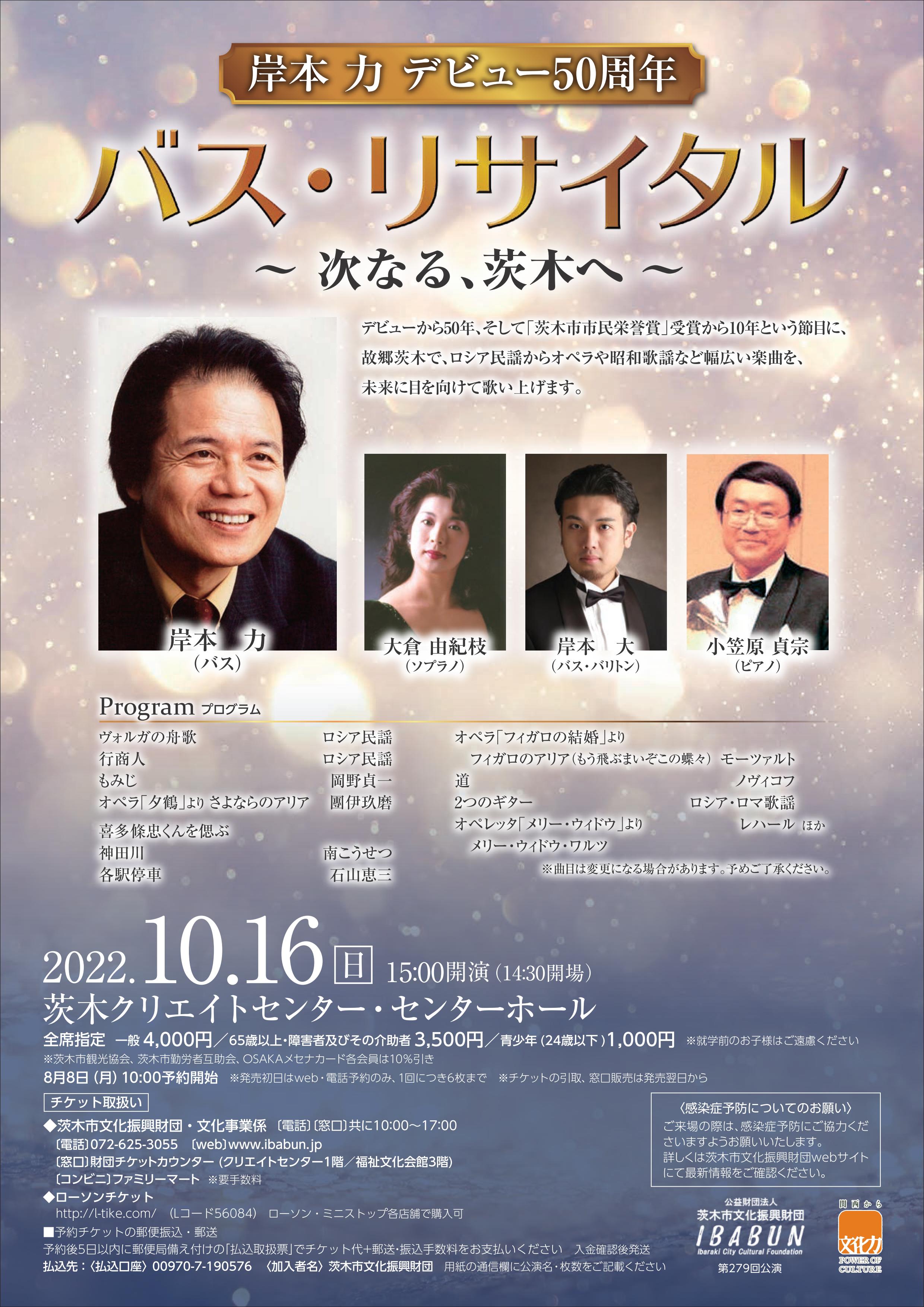 全席指定 4,000円 ※茨木市観光協会、茨木市勤労者互助会、OSAKAメセナカード各会員は10%引き(割引は本人のみ。この取り扱いは財団窓口のみ。) 発売日:8月8日(月) 発売初日はweb及び電話の予約受付のみです。 |